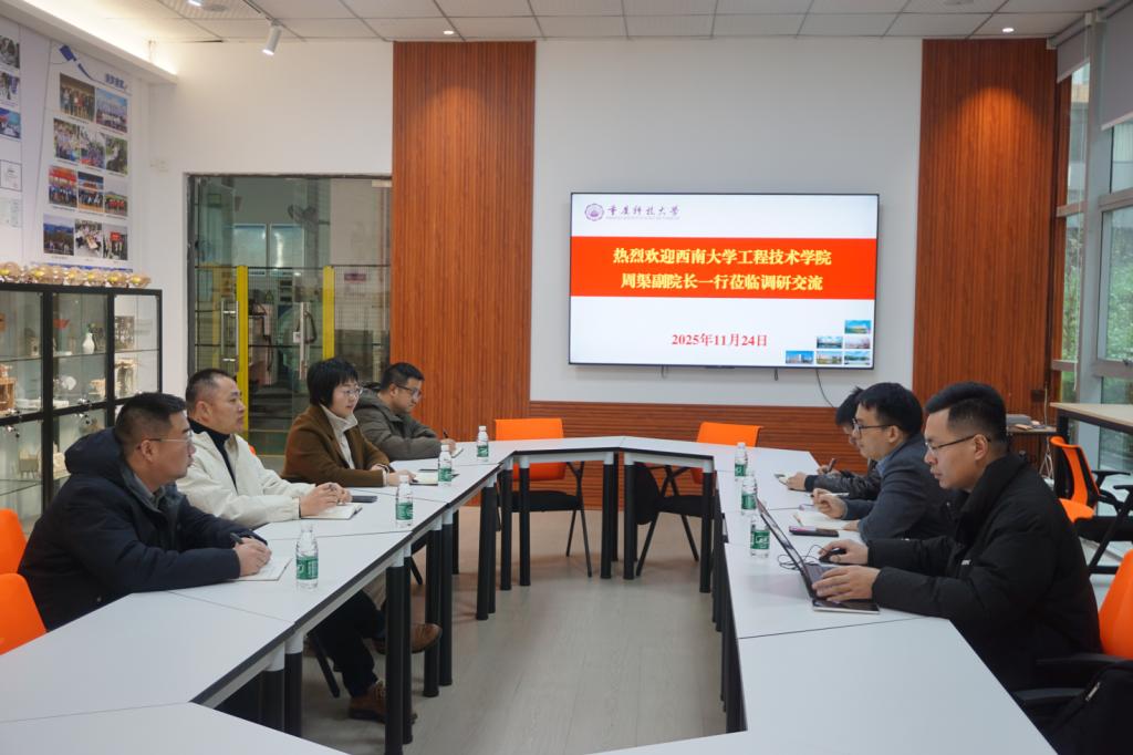 2025年11月24日,西南大学工程技术学院副院长周渠一行三人到工程训练中心进行调研交流。党总支书记陈皎娇、中心主任何高法、办公室主任邱杨、工程实训部部长周明举参加座谈,双方围绕工程训练中心的建设与发展进行了深入交流。
