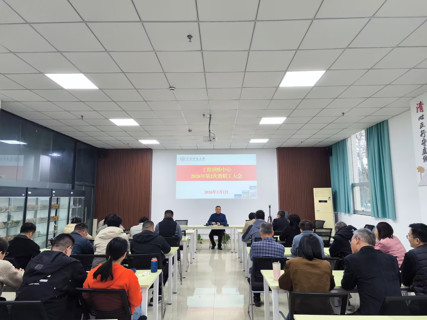 为扎实做好新学期开学各项准备工作,3月1日下午,中心召开全体教职工大会,总结假期工作,部署新学期各项任务。会议对新学期的实训教学计划、师资调配、设备维护及课程改革等重点工作进行了详细安排。会议强调,全体教职工要进一步提升安全责任意识,做好场地、设备等安全隐患排查,做好教学准备工作,以饱满的热情投入到新学期的教学工作中,不断提升工程实践教学质量,培养学生的创新精神和动手能力。会后,中心领导带队对各实训区域安全、卫生及设备运营情况进行了检查。